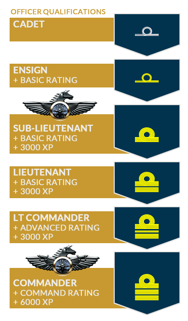 Initial entry is as a cadet. After basic training, the cadet will be asked to select a rating to train towards. When this is completed the newly promoted ensign is now able to join missions and begin to gain experience.